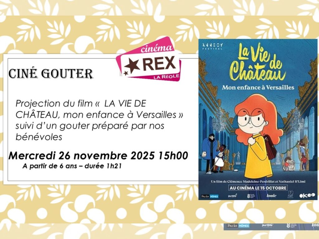 Ciné-goûter : Venez passer un après-midi au cinéma, un film pépite suivi d’un goûter concocté par nos bénévoles Maie Claire et Chantal. La vie de château : Violette a 8 ans, du caractère à revendre et un nouveau tuteur. En effet, depuis la mort de ses parents, elle doit vivre chez son oncle Régis, agent d’entretien au château de Versailles. Lui, c’est un géant bourru, elle une petite fille têtue qui refuse de lui parler et fugue dès qu’elle peut ! Mais dans les coulisses dorées du Roi Soleil ces deux solitaires vont peu à peu s’apprivoiser, apprendre à se connaître, et se découvrir une nouvelle famille… À partir de 6 ans.