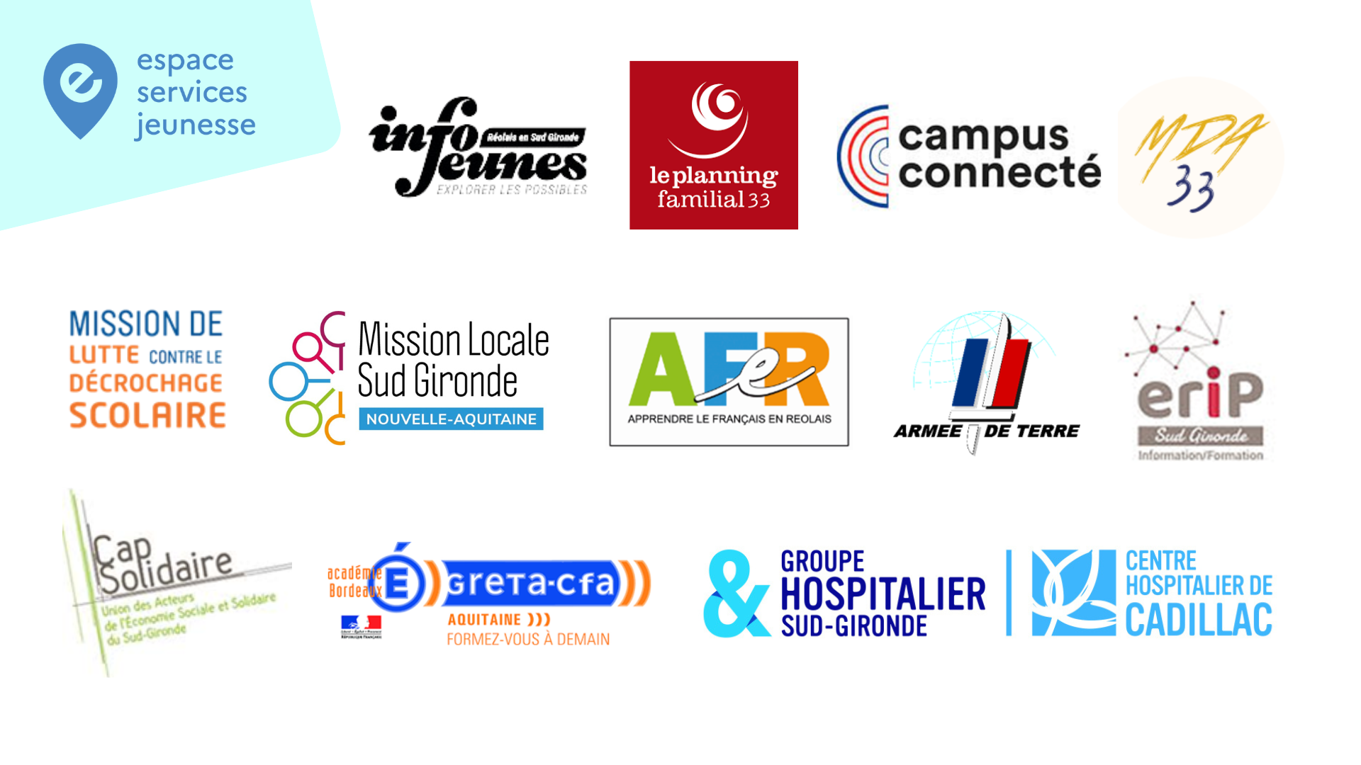 Des partenaires essentiels y tiennent des permanences régulières : Mission Locale du Sud Gironde, ERIP du Sud Gironde (Espace Régional d’Informations de Proximité), Cap Solidaire, le Planning Familial, la Maison des Adolescents, le Campus Connecté, l’AFER (Apprendre le Français en Réolais), le Greta, l’Armée de Terre, la Mission de lutte contre le décrochage scolaire et le SAAVIF (Service d’Aide et d’Accompagnement aux Victimes de Violences Intrafamiliales).